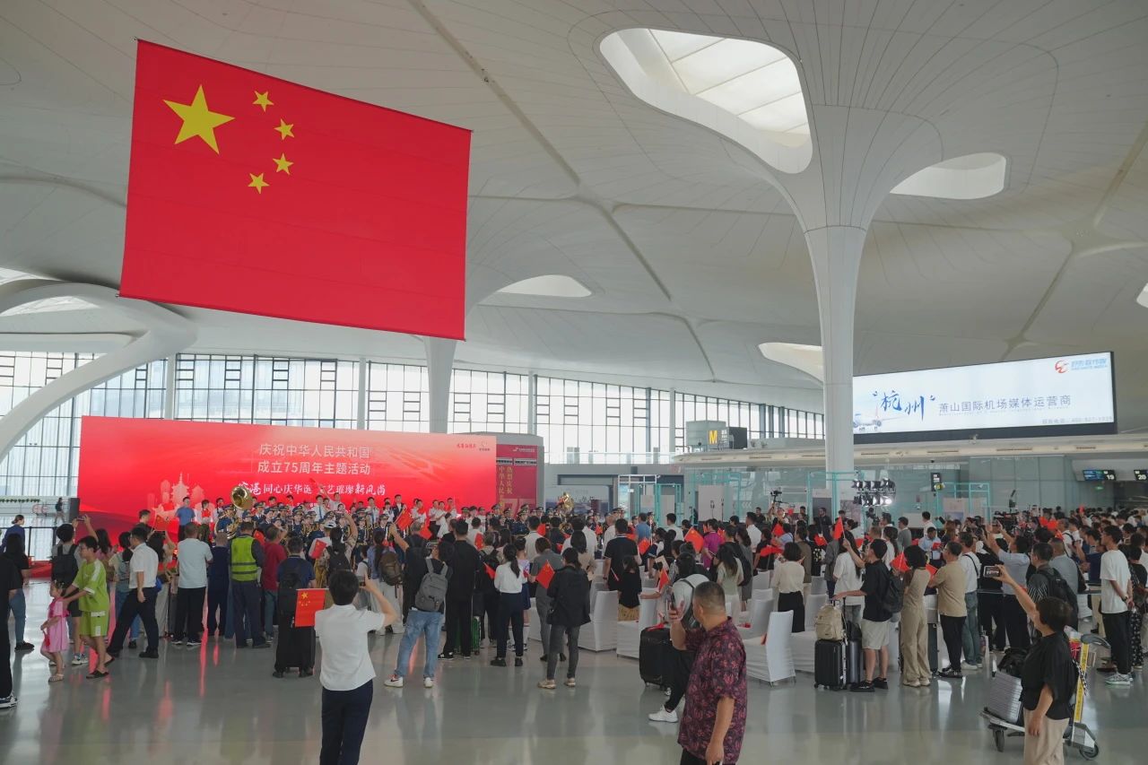 不少旅客掏出手機記錄下這動人心弦的瞬間,來自湖北的旅客葉女士說:“國慶帶著一家人出行,沒想到在杭州機場看到這么精彩的演出,非常振奮人心,為我們偉大的祖國感到驕傲和自豪。”