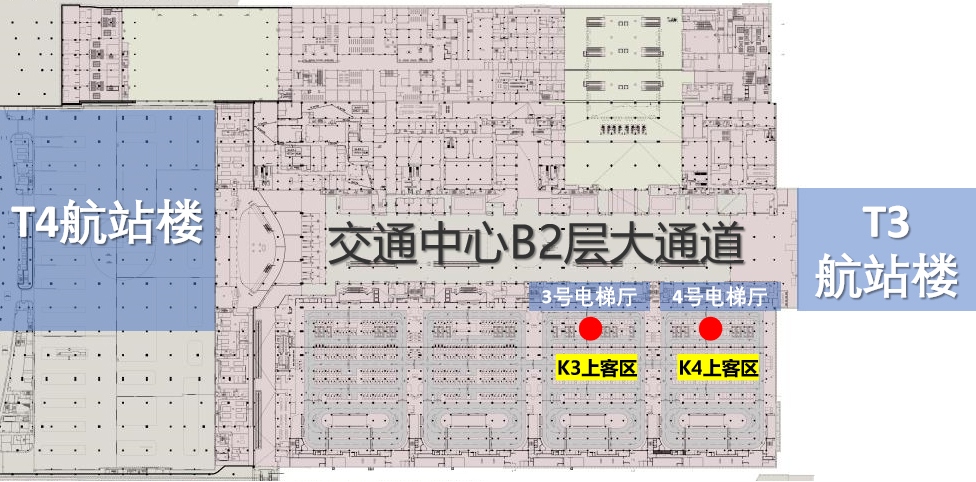 T4旅客可從交通中心2F層根據標識乘坐扶梯或垂直電梯下行至B2層。
