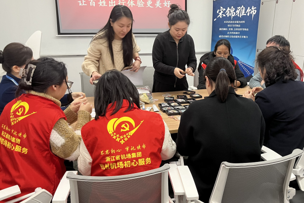 在緊張的服務(wù)工作之余,航站區(qū)中心也注重志愿者團隊的凝聚力建設(shè)。2月6日,特別聯(lián)合中國絲綢博物館舉辦“宋錦雅飾”手作活動,邀請站點工作人員及志愿者共同體驗宋錦胸針、掛飾等制作,在服務(wù)間隙放松身心、陶冶情趣,實現(xiàn)勞逸結(jié)合。